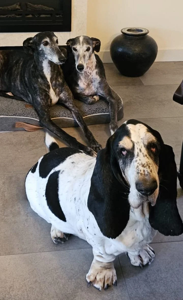 Adarah en Katy de twee Spaanse windhonden met slanke lijven, scherpe ogen en een neus voor avontuur. Deze dames lopen alsof ze de wind zelf zijn: elegant, stil en altijd in beweging. Wandelen met hen is geen rondje, het is een ritueel. Ze zijn er altijd klaar voor. Vooral als er lekker wat kilometers in zitten. Tot voor kort liep Cobus nog met ze mee. De basset van de familie. Alles wat zij in de hoogte hadden, had hij in de breedte. Cobus was de koning van het ontvangstcomité. Bij binnenkomst stond hij als eerste klaar – staart zwaaiend, ogen glimmend, oren wiebelend. Alsof je elke keer opnieuw zijn dag kwam maken. Helaas moesten we onlangs afscheid nemen van hem. Zijn lijfje was moe. De wandelingen zijn stiller zonder zijn dappere, blije tred. Maar ergens loopt hij nog mee.